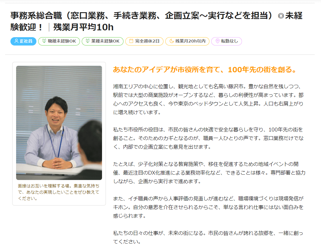 藤沢市にある湘南は、毎年訪れるほど個人的に好きな街。観光客やサーファーも多く駐車待ちの渋滞は夏の風物詩でもありますが、そんな困った景色を変えてしまうかもしれないのが、今回募集を行なうDX戦略推進です。ICTを活用したより良い市民生活を考え、形にしていくというミッションは本当に壮大で、ワクワクしながら取材をしました。その他制作を担当した保育士も、土木総合職も、根底にあるのは藤沢市民の生活をより良くしたいという想い。ぜひたくさんの方に求人広告を見ていただき、藤沢市でより良い未来を共に創っていく喜びを感じていただけたら嬉しいです。