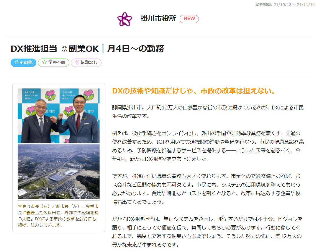 今回副市長という重要なポジションということもあり、エン・ジャパン×掛川市で連携協定を結んで支援を行ないます。