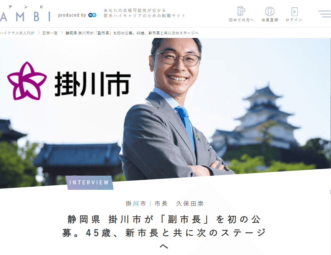誰もがチャレンジできる街。その根幹にある久保田市長のご経験に、私自身と身が引き締まる思いでした(気になる方はぜひAMBIインタビューを!)。生きているから、やりたいこと、実現したいことを全力でできる。その思いを市政にぶつける市長のもとで、掛川市のさらなる発展を目指す副市長をはじめとした重要ポジションの採用支援をさせていただけること、大変光栄です。良いご縁がつながるよう、全力でサポートします!