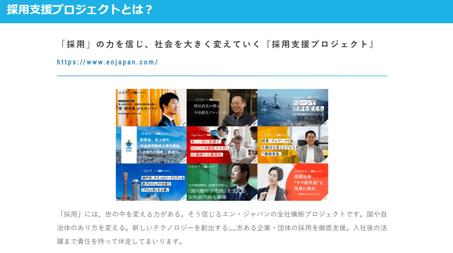 ※採用支援プロジェクトとは:社会的に影響力の大きい中途採用について、特別にエン・ジャパンオールで支援するプロジェクトです。採用支援、および入社後の活躍・定着支援を行うことで、支援先の事業の発展、入社者の仕事人生の充実に寄与します。これまでの支援PJT一覧はこちら