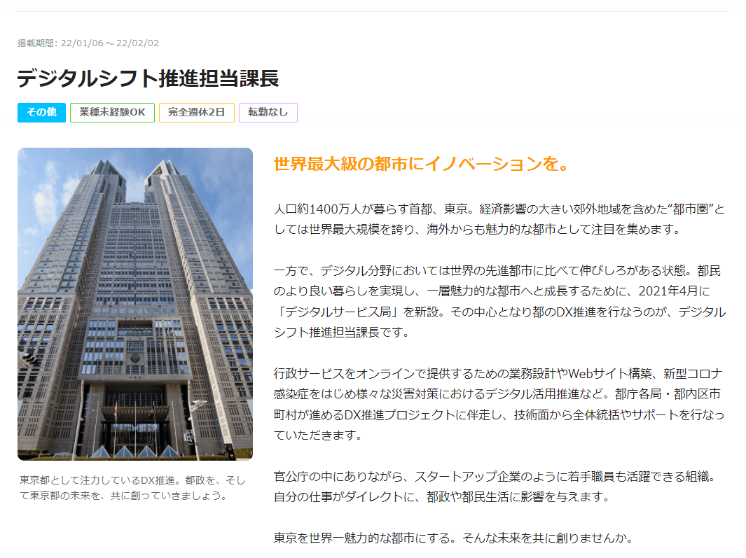 私自身、進学してからずっと東京都民なので、都政や都民生活に改革を起こす今回の募集は、興味深く取材させていただきました。職員の方へのインタビューでも、「飲食店が感染対策を十分行なえているか、確認・認証するシステムの開発を手掛けた」など、私たちの生活にダイレクトに関わるプロジェクトエピソードがたくさん。都庁の中でも立ち上げ間もない組織だからこそ、大きなやりがいを持って仕事にのぞまれているのが印象的でした。いち都民としても、DXでより良い東京都をつくりたいという熱い想いを持つ方にご入職いただけたら嬉しいです。