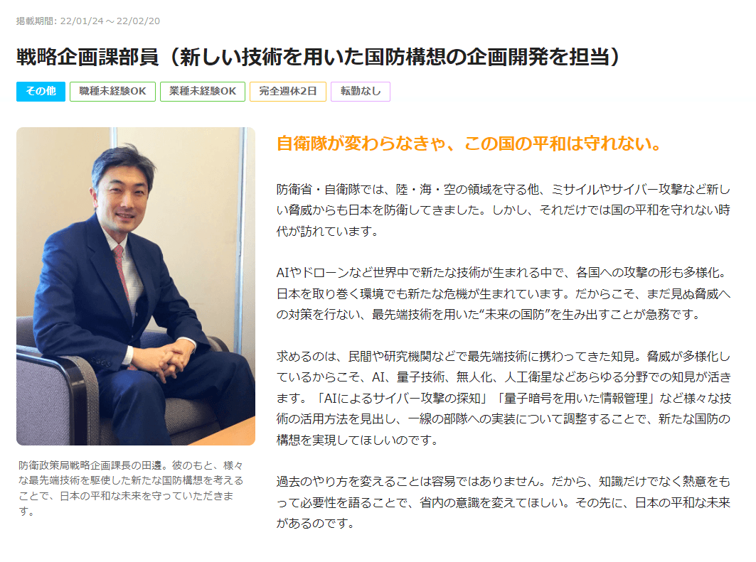 防衛省のソーシャルインパクト採用プロジェクト開始!国の安全を守る4職種を募集します。 #きょうのエン