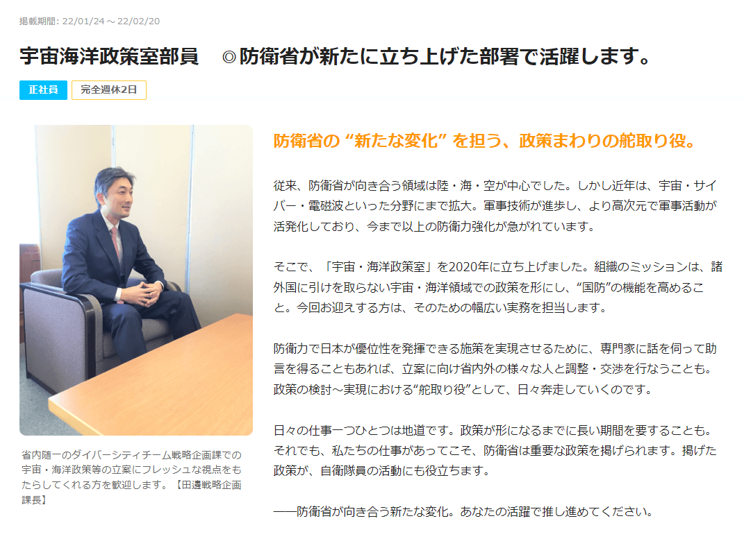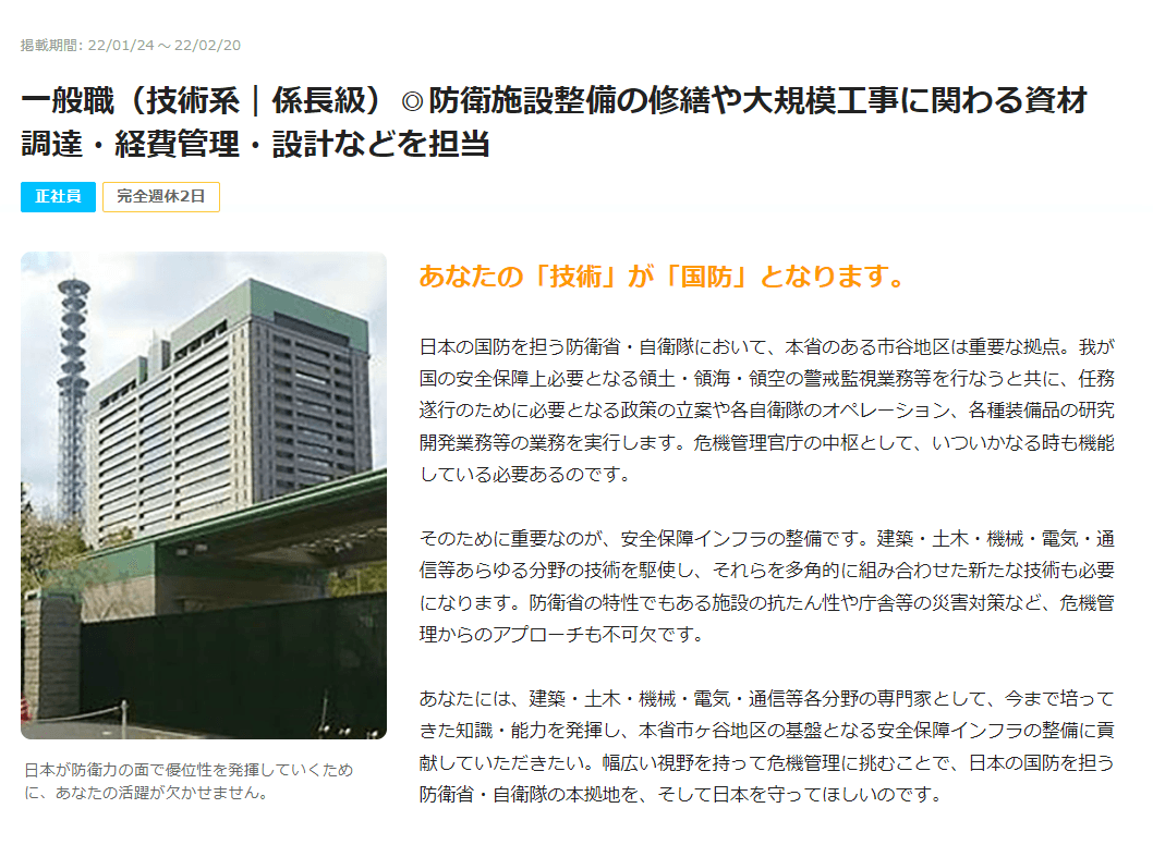 防衛省の採用のお手伝いはなんと今回で4回目!いつも大事なミッションをお任せいただきありがたい限りです。今回は防衛省の基礎を守る修繕・情報システムと、新しい国防を考える宇宙分野、新技術を用いた戦略企画の4職種での公募。今の知識・経験を国防分野で活かす選択肢、ぜひ社員の皆様にもSNSなどでシェアいただけるとうれしいです!