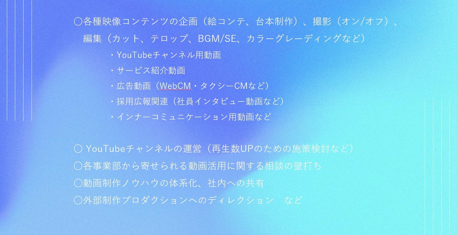 ミッションは、映像の力でエンの企業/サービスブランドが目指す世界観を創り、拡げていくこと。