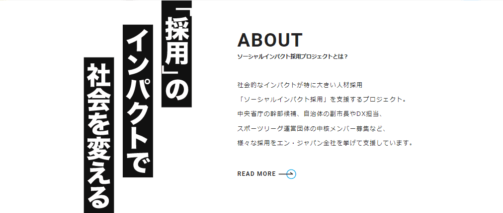 「採用のインパクトで社会を変える」ソーシャルインパクト採用PJのコンセプトを端的に伝えるページを新設。トップページにも一部を抜粋して記載しています。採用の力で世の中をより良く変えていきたい。誰かのため、社会のために懸命になる人を増やし、支援したい。そんな思いとプロジェクトの意義が伝わるコピーにできたのではと思っています。ぜひご一読ください!(ライティング、担当させていただきました!)