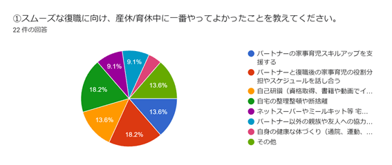 ・復帰前に開催された「ママ座談会」の中で、家事を可視化することをお勧めされたため実施しました!何気なく毎日していた小さな家事も改めて可視化することで、意外と毎日やっていることが多いなと旦那に主婦の大変さを伝えることが出来ました。それにより、家事担当をしっかり分担することもでき、タスクとして旦那もこれまで以上に家事をやってくれるようになりました。