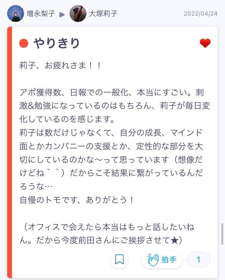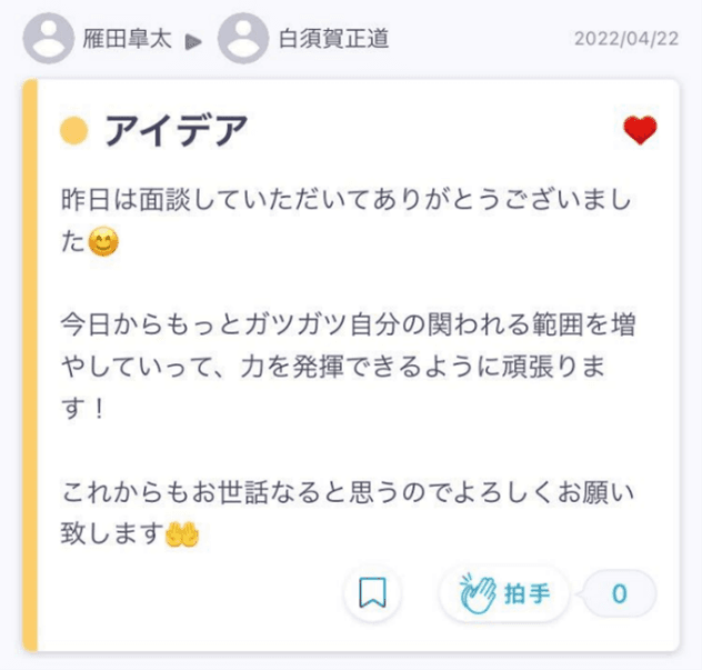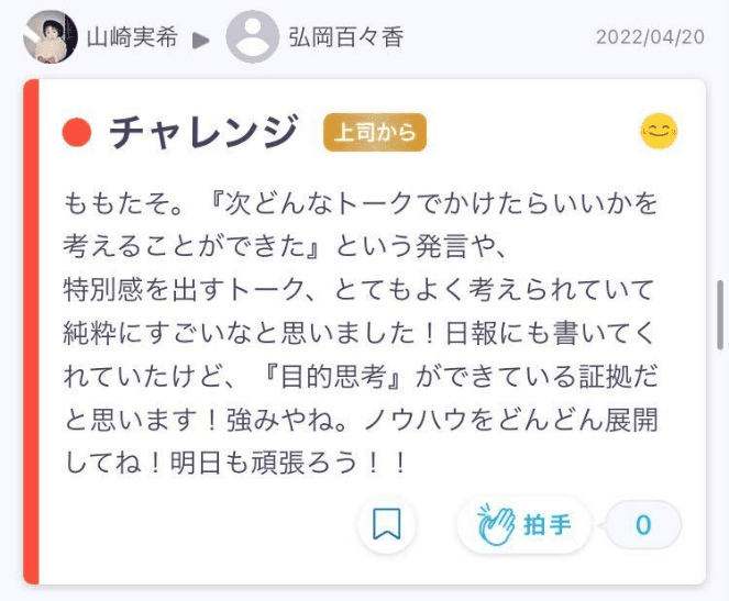 めちゃくちゃ嬉しかったです!私の発言だけでなく日報の工夫まで見てくれていていたことが分かりました。新しい業務に関して不安だらけでしたが、具体的な発言や行動を褒めてくださることで、今まで自分の言動が「間違っていなかった」と確認でき、安心しました。