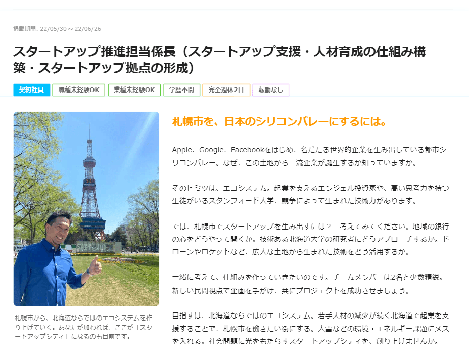 札幌市のプロジェクトは今回が初!募集するのは、スタートアップ支援を担う「スタートアップ推進担当係長」です。