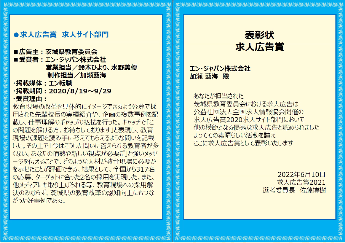 全国求人情報協会(※)に加盟する求人メディアが手がけた求人広告の中で、読者・ユーザーに有益な情報提供を行なうことにより、人と企業のマッチングに貢献した事例を広く収集し、採用成果に貢献した求人メディアの担当者を表彰する名誉ある賞。求人メディアの持つ力を社会にアピールし、より健全な求人情報流通促進を狙うものです。2004年からスタートし、今年で18回目の開催となりました。今回、2021年4月~2022年3月に掲載された求人広告から13社86点のエントリーがあり、そのうち求人サイト部門64点から求人広告賞として選出されました。