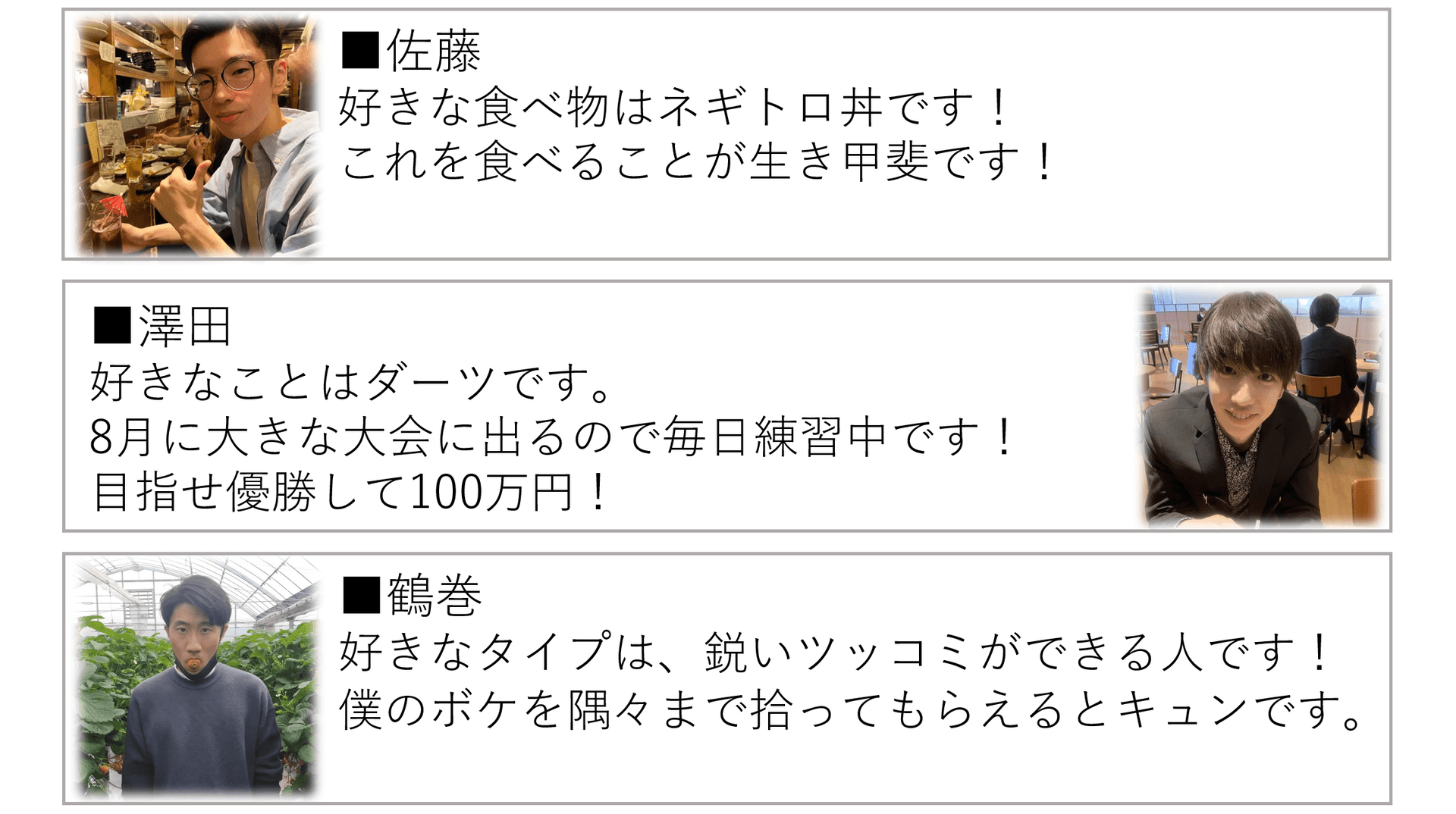 結局直感が一番大事かなと思っています。就活=恋愛とゼミの教授は言ってたのでそれに従いました。正直、他社と迷っていたのですが「この会社と結ばれたい」と思ったゼクウに決めました。最終面接がクリスマスイブだったので、クリスマスマジックではなかったことは働いて確信している日々です。(鶴巻)