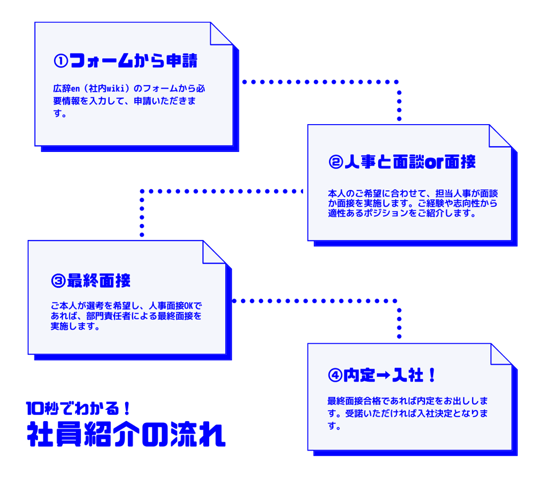 専用フォームより受け付けています!広辞en(社内wiki)に紹介用のフォーマットを用意しているため、フォーマットの内容を記入の上、WEBから申請いただければOKです◎ その後のご紹介いただいた方への連絡などは、人事から行ないます。※フォーマットは、「社員紹介」「リファラル」で広辞enを検索してください^^