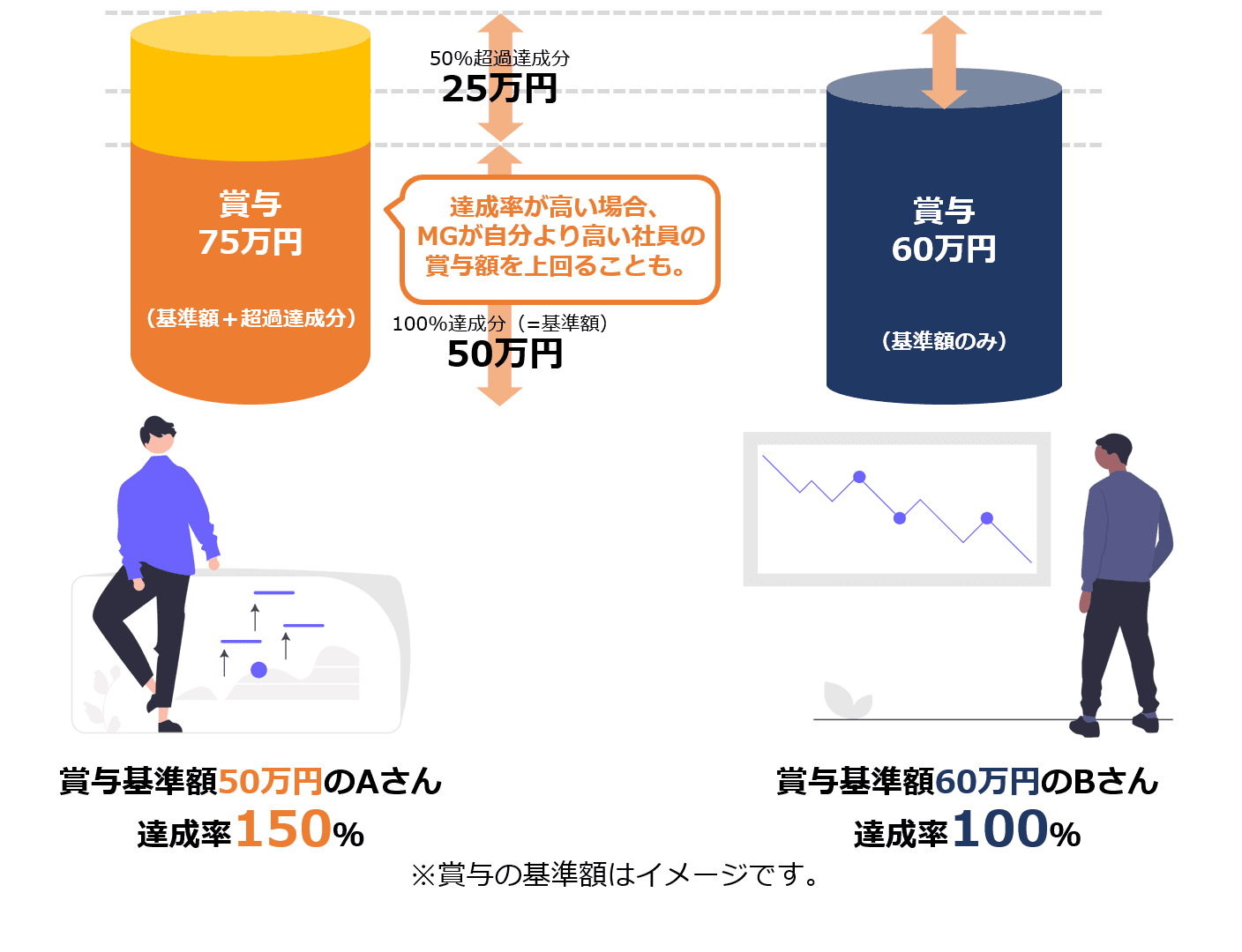 たとえば以下のように、MGが低くても達成率が高かった場合は、自分よりMGが高い社員より賞与をたくさんもらえることもありますよね。