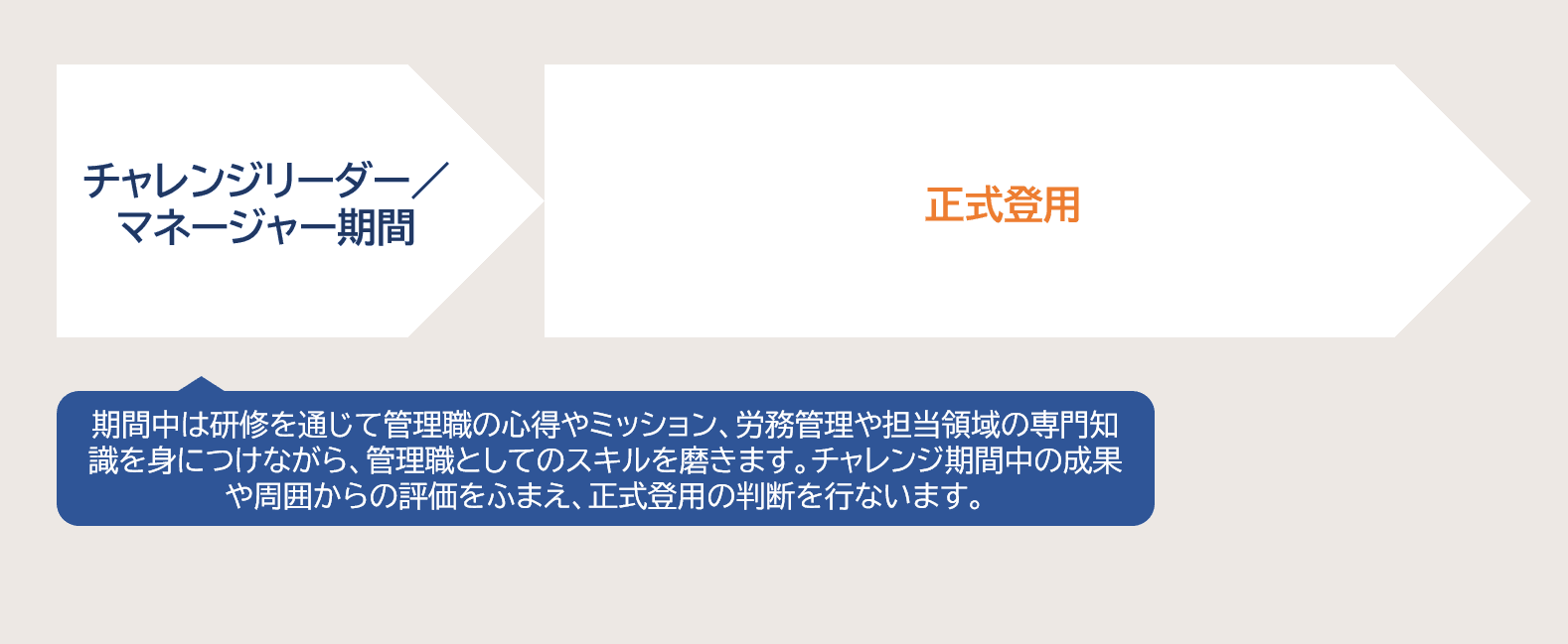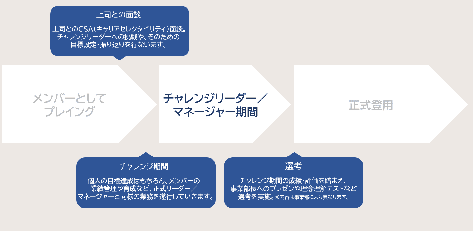 チームリーダー、マネージャーなどのポストに「お試し」で挑戦できる制度です。 入社2年目などの早い段階から身の丈以上のミッションに挑戦できるため、成長スピードも加速します。