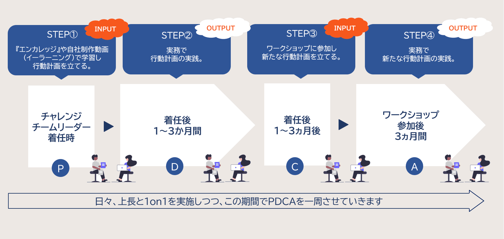 なのでエンには、着任前の「座学」で行動計画を立て、実務での「実践」と「フィードバックをもらうこと」を繰り返しながら、約半年かけてマネジメントスキルを磨いていくプログラムがあります。