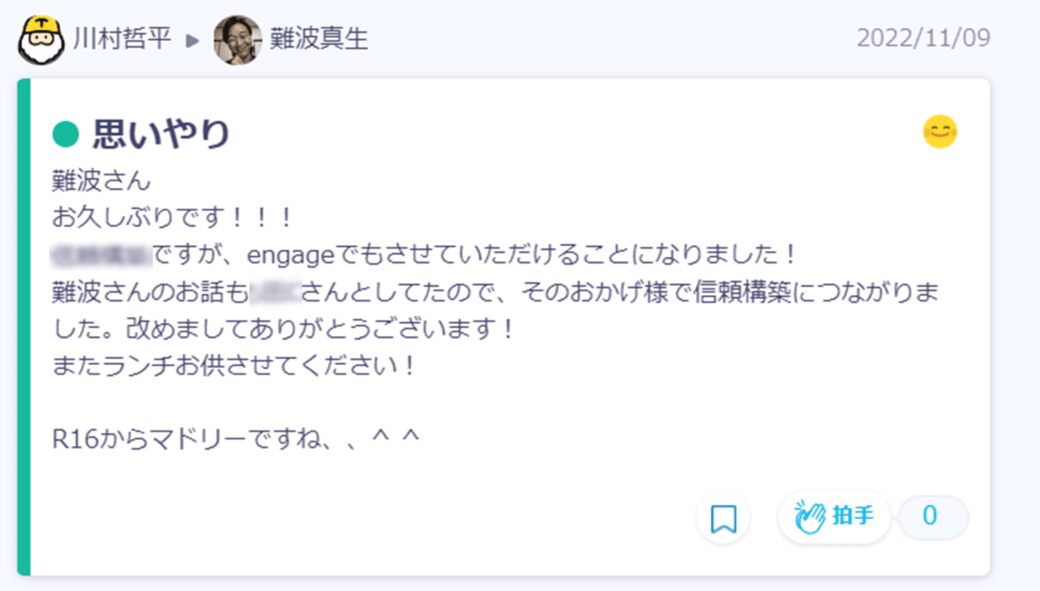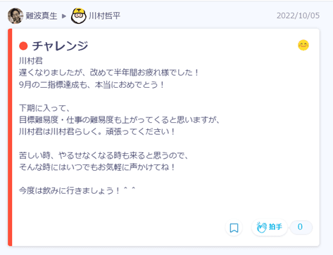 これは、仕事で偶然、私と川村さんの案件が重なったことがあったんです。相手先の方と話しているときに川村さんの名前が出て、「実は、私がメンターをしています…!」って話になり(笑)