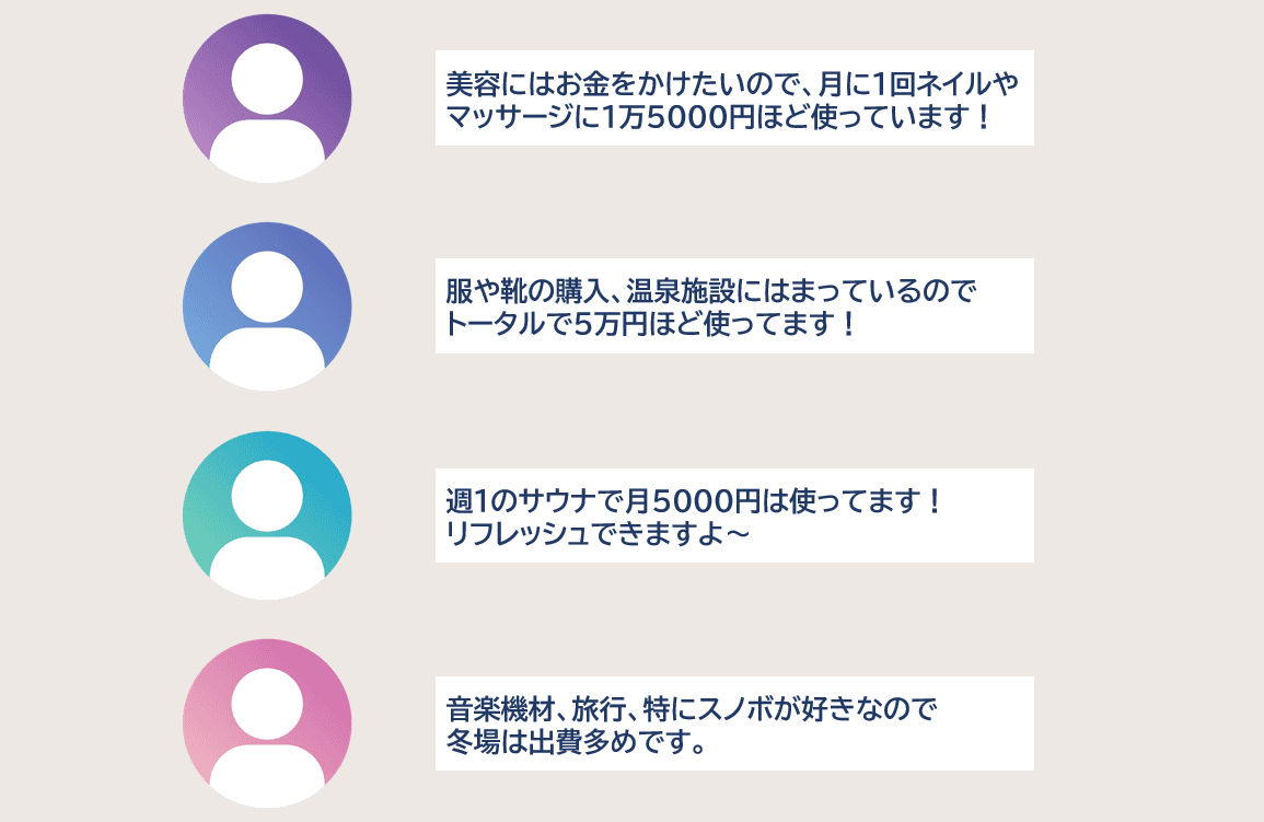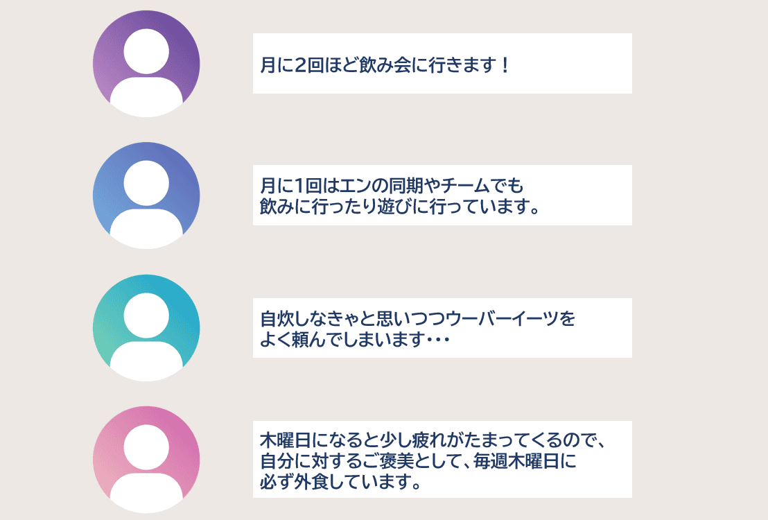 今回はせっかくなので、実際に1年目社員に匿名で、私生活でのお金の使い道について聞いてみました!
