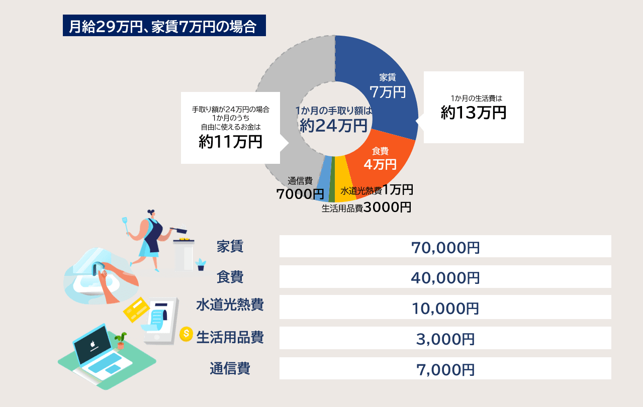 こうして生活にかかる費用を具体的に考えてみると、手取りが24万円で仮に家賃7万円の家に住む場合、生活費も差し引いて残りは月11万円。