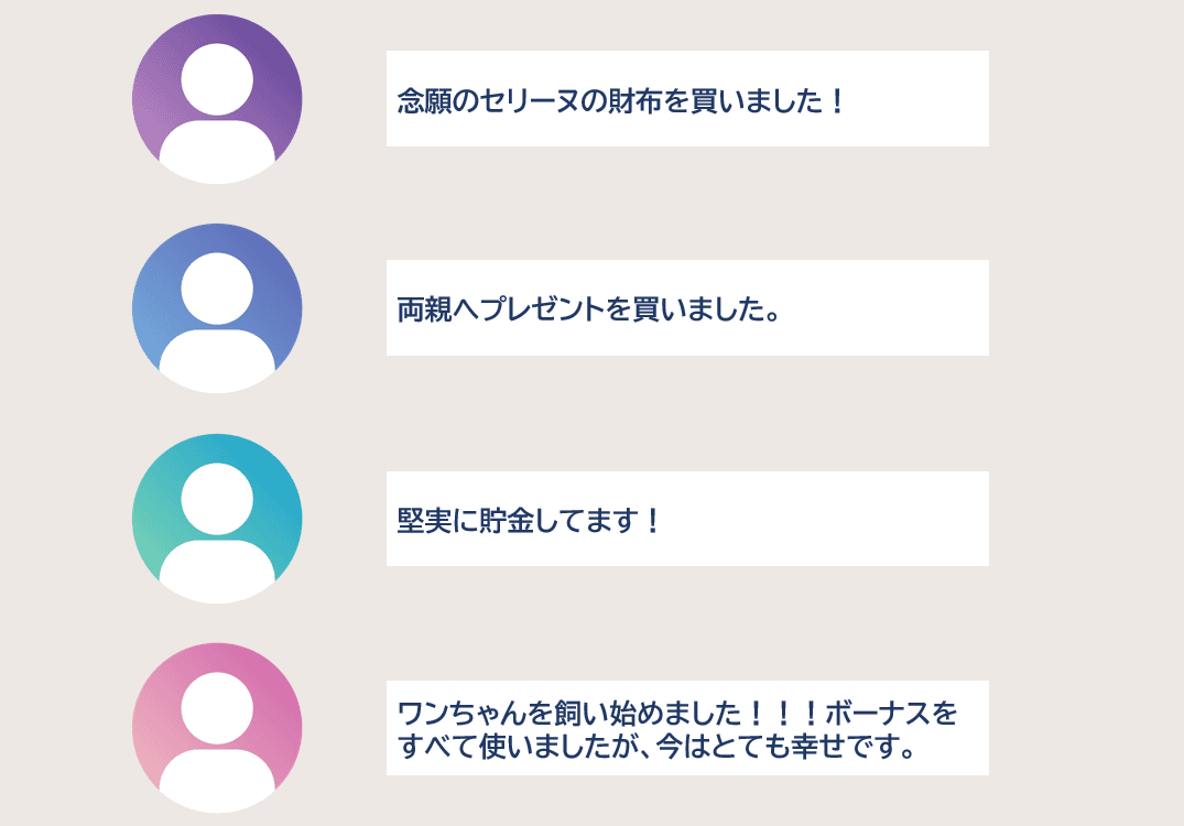 私は1年目のボーナスでずっと欲しかった大きめのソファを買いました!