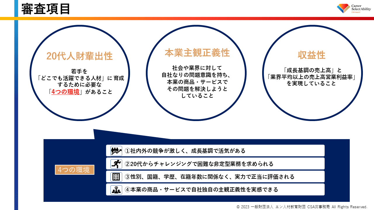 CSA賞では、このCSAの4つの環境を20代人財輩出性として審査しています。