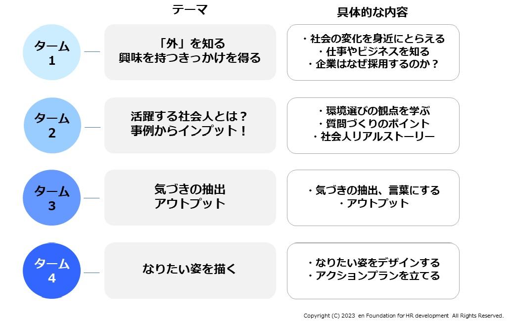 単にインプットを増やし、「なりたい姿」を描くだけではなく、職業観やキャリア観の醸成につながるアウトプットを重んじてきました。「誰のためにどんな仕事で役立ちたいか」という問い、「CareerSelectAbility🄬」(「キャリア自己選択力」)などのフレームに沿って将来や仕事を考えることで、生活のためやお金を得るためだけではなく、他者への貢献や具体的な働き方、仕事を通じた成長についてのイメージが具体化されたと考えます。