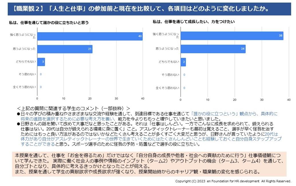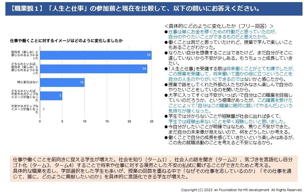 授業最終回に、職業観やキャリア観の変容に関するアンケートを実施しました。