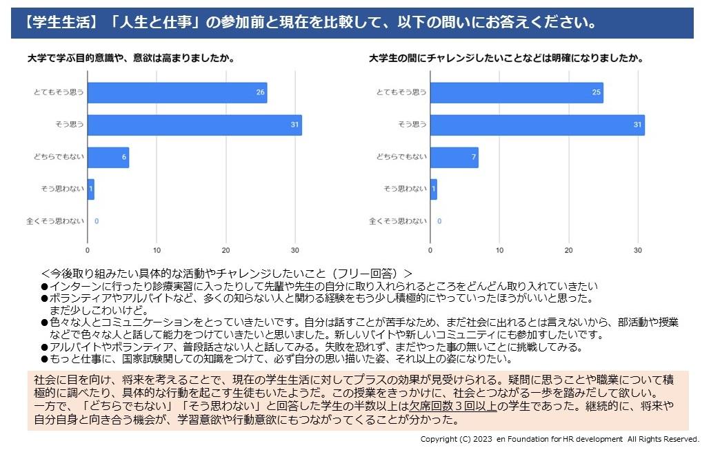 本講義にて、私たちが提供したキャリア教育プログラムが学生の将来やキャリア観、職業観に与える影響について、授業後アンケート結果をもとにまとめました。