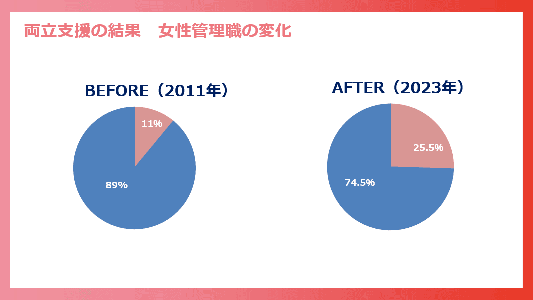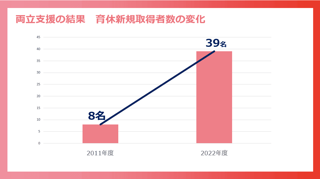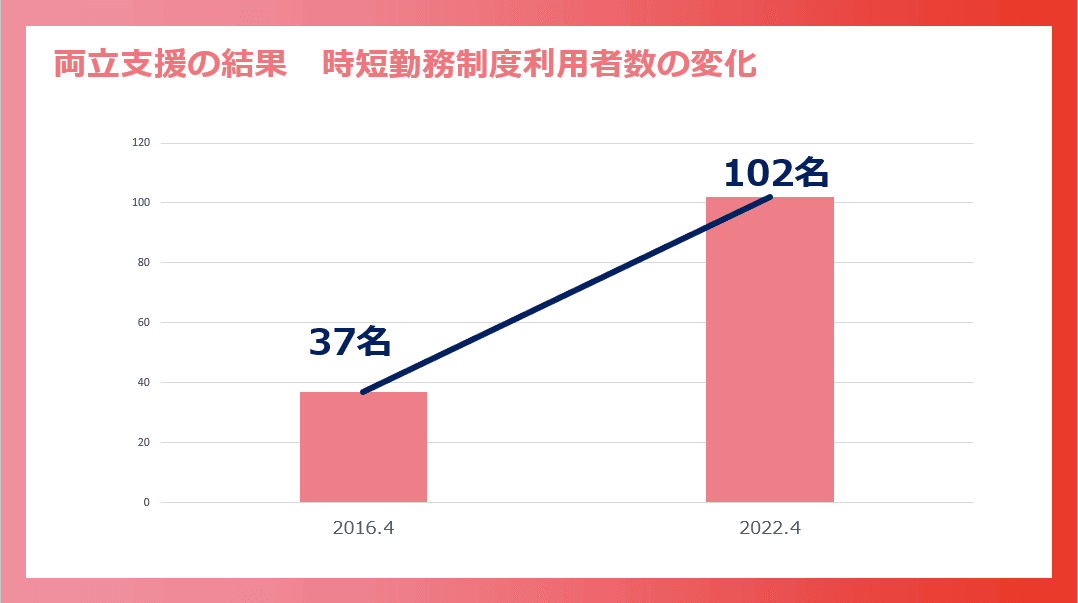 このような取り組みで、女性管理職比率や時短勤務者数、育休新規取得者数にも過去と比べて大きな変化がありました。