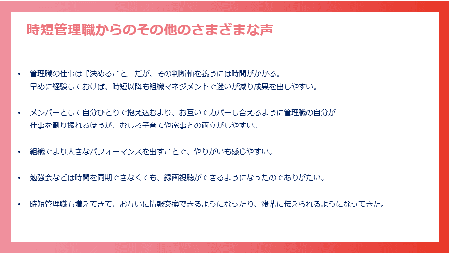さらに時短で働く管理職の女性社員も増加傾向に。時短管理職社員の皆さんからはこんな声も寄せられています。