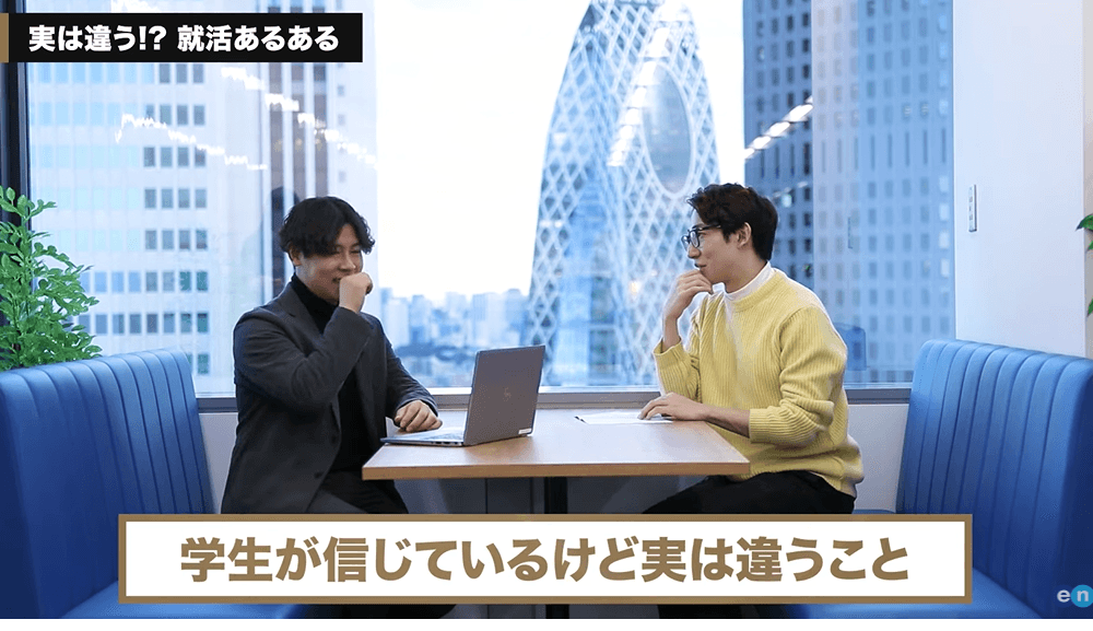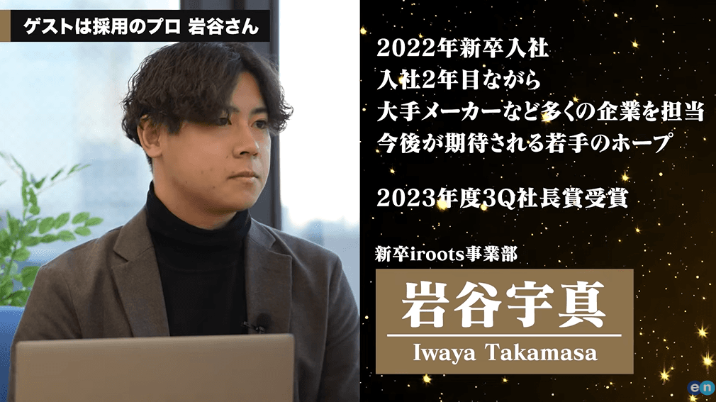 そこで・・・YouTube最新動画では、前回のキックオフで社長賞QMVPを受賞したiroots事業部・岩谷さんをゲストに迎え、ここでしか聞けない『就活のポイント』を伺いました。
