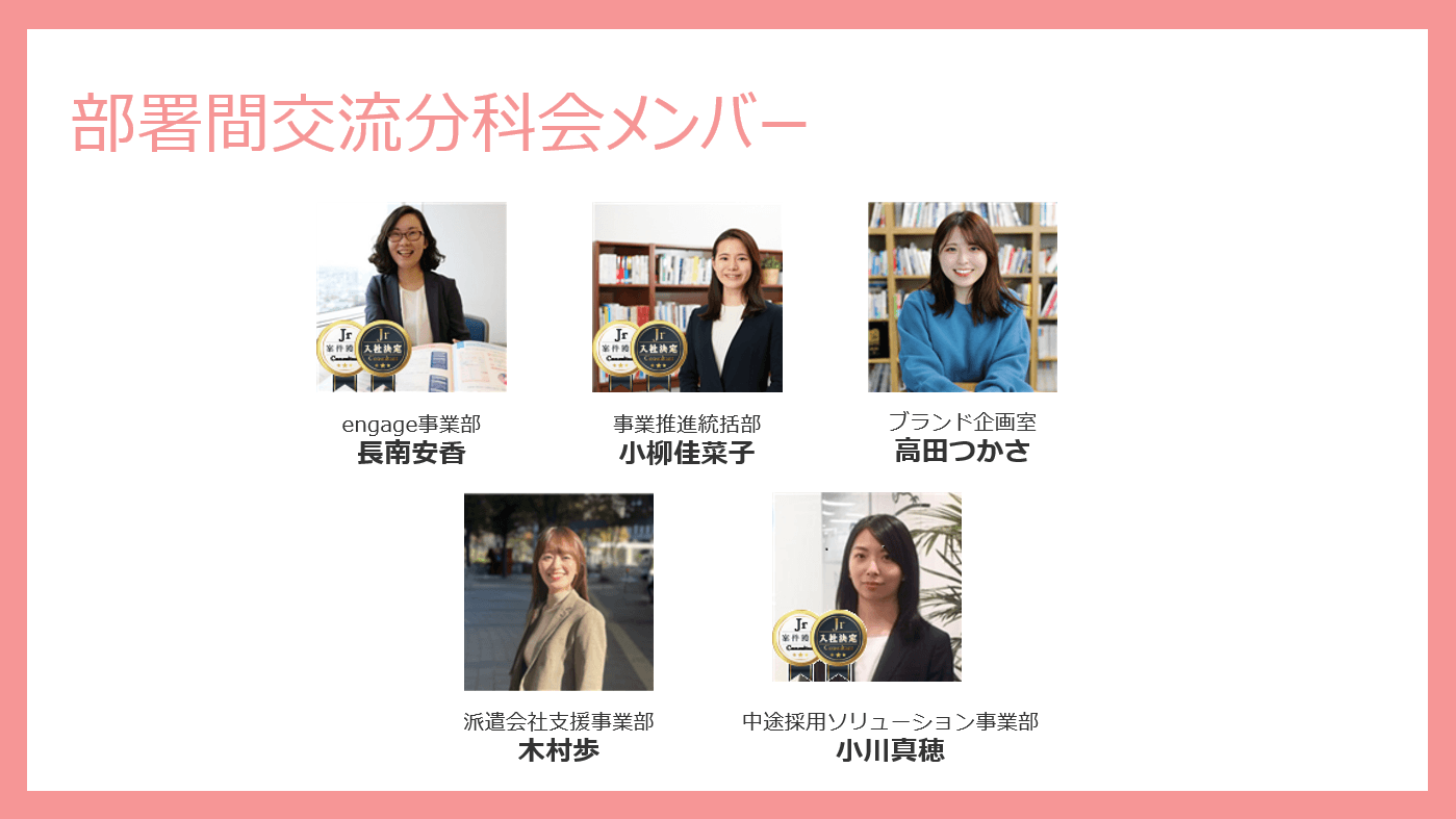 中でも私が所属する「部門間交流分科会」は、みなさんのキャリア形成や活躍に向けて、事業部を超えてのコミュニケーション活性化を目的としています。
