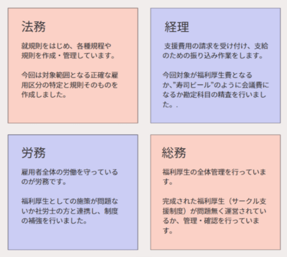 はい、まず今回管理本部で関わったのは4つの部署で、労務・法務・総務・経理です。