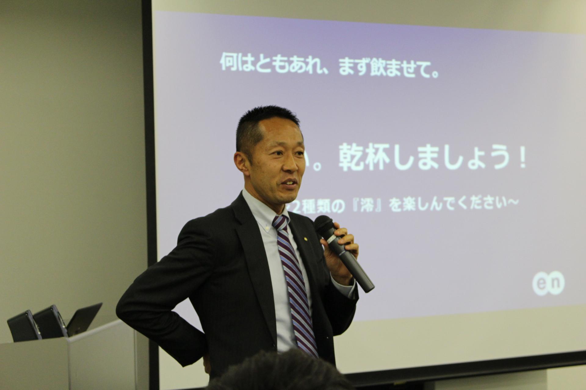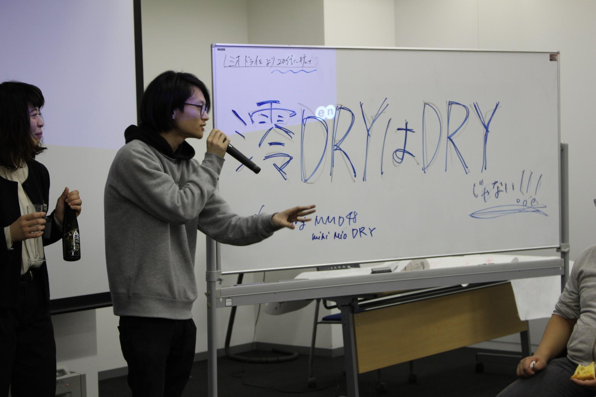 お酒が入っているからか、夜だからか、徐々にヒートアップしていく会場。新村さんへもどんどん質問が投げかけられます。そして時間は過ぎていき、いよいよプレゼンテーション!