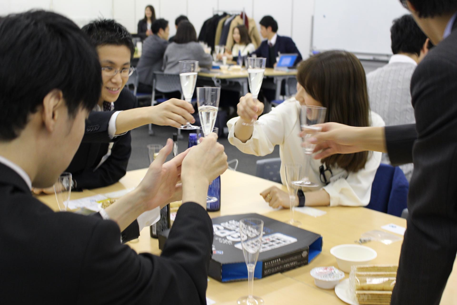 美味しいお酒を頂きながら、宝酒造のビジネスモデルや酒造業界について学びます。ちなみに宝酒造の「宝」は「田から」来ているんですよ。